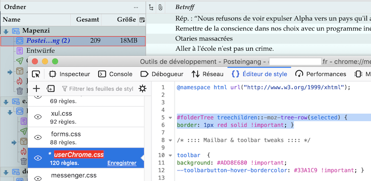 Wenn der selektierte Ordner im Fokus eine andere Hintergrundfarbe hat (Z. B. dunkelblau) , ist die Randfarbe u. U. wenig auffällig. Dann kann man noch den folgenden Zusatz-Code einfügen