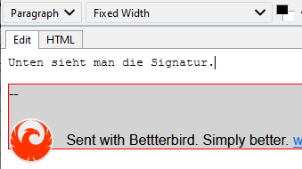 - Bei der Signatur erscheinen immer 2 Bindestriche (--) bevor diese losgeht. Der Bereich mit den Strichen hat die Formatierung "Normaler Text" und "Variable Breite". Erstelle ich eine Neue E-Mail ist das kein Problem. Beim Antworten auf Nachrichten, manchmal schon. Ich habe unter Konten-Einstellungen -> [E-Mail Konto] -> Verfassen & Adressieren ausgewählt, dass bei Antworten die Signatur ÜBER der zitierten Nachricht platziert werden soll, also nach meiner geschriebenen Antwort. Die Signatur wird korrekt platziert, die beiden Bindestriche werden entfernt, aber irgendwo da bleibt ein unsichtbarer Bereich mit der fehlerhaften Formatierung. D.h. ich Tippe meine Antwort und lande von meiner global eingestellten Formatierung (Einstellungen -> Verfassen -> HTML Optionen) in einem unschönen anderen Format. Gerade wenn man Sätze umschreibt oder neu positioniert, sieht die Mail beim Empfänger nicht besonders professionell aus. Es wäre schön, wenn die Signatur nahtlos in die Nachricht übergehen würde - wenn keine font-family im Signatur HTML hinterlegt ist. Es würde auch vermutlich helfen festlegen zu können, wie die Trennung (technisch und visuell) zwischen Nachricht und Signatur passiert: z.B. nicht über 2 Bindestriche, sondern womöglich über eine horizontale Linie (20% Länge) oder 1 Absatz usw.
