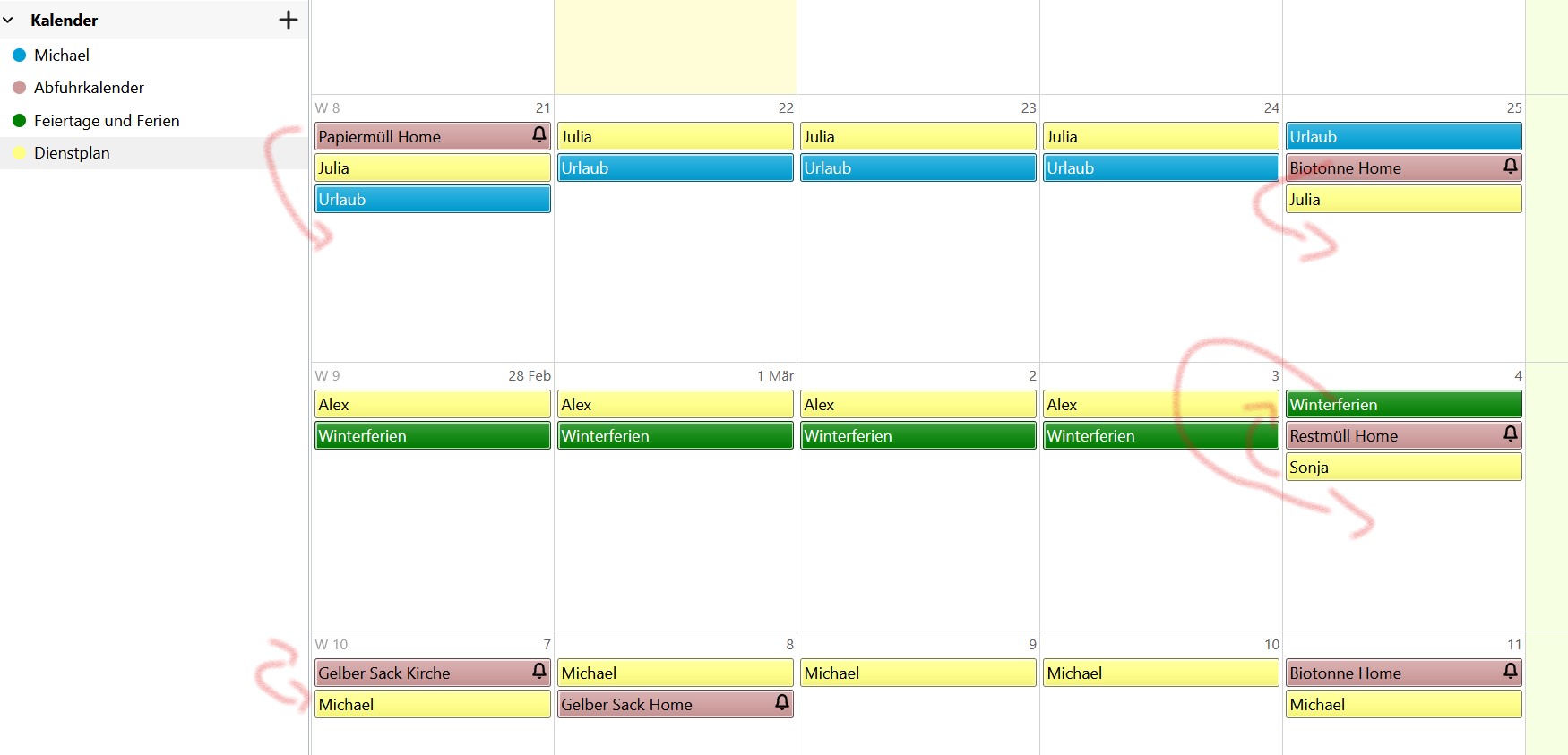 Ich habe im aktuellen Thunderbird-Kalender mehrere Kalender wie Müllabfuhr, Urlaub und Dienstplan. Wenn in unterschiedlichen Kalendern Termine enthalten sind, dann werden diese in einer (für mich) merkwürdigen Sortierung angezeigt. Mal steht der einen Kalender oben, mal der andere. Ich finde das unübersichtlich. Wäre schön, wenn die Reihenfolge immer die gleiche wäre.