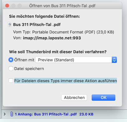 Im Dialogfeld "öffnen von" bleibt der Button zur Vorauswahl für "Öffnen mit" nicht vorausgewählt - sondern alle Button Felder bleiben immer ohne den Auswahl-(Punkt). Im Drop-Down-Menü zur Programmauswahl bleibt das letztgewählte Programm allerdings erhalten - was so über die letzten Jahre schon funktionierte. Ich hoffe das ist verständlich ausgedrückt, bei Bedarf erstelle ich gerne eine Abbildung. Das Verhalten war vor TB 91.4.1 anders - TB hatte die letzte Auswahl immer vorausgewählt. Einfacher Klick auf Enter und das jeweilige Programm startete.
