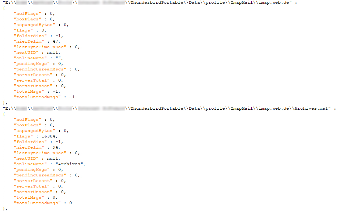 Also in der TB portable Datei folderCache.json stehen auch absolute Pfade drin. Vom Format her sind sie gleich denen in der "panacea.dat" aber die Einträge sind optisch besser lesbar aufbereitet in der folderCache.json Datei. Auch hier stehen aber wieder ältere Einträge drin von Pfadangaben zu Accounts die es im TB schon lange nicht mehr gibt. Wenn ich jetzt, wie gewünscht, die beiden "folderCache.json" Dateien (einmal original Pfad und einmal verschoben) vergleiche fällt auf das gleich ganz oben in der Liste die Pfade aktualisiert wurden auf den jetzt aktuellen Pfad wo sich TB nach dem verschieben befindet.