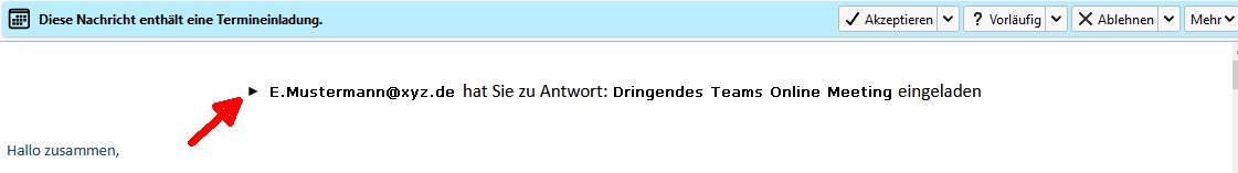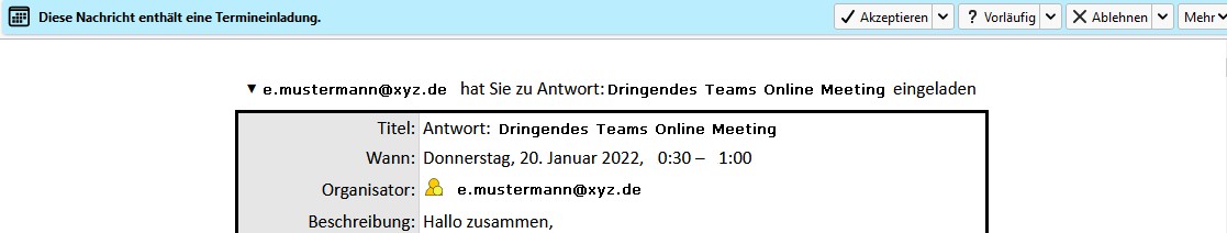 Und zwar sehe ich zwar den Einladungtext und die Knöpfe zur Terminbestätigung, aber der eigentliche Termin (Datum, Uhrzeit) wird nicht angezeigt.