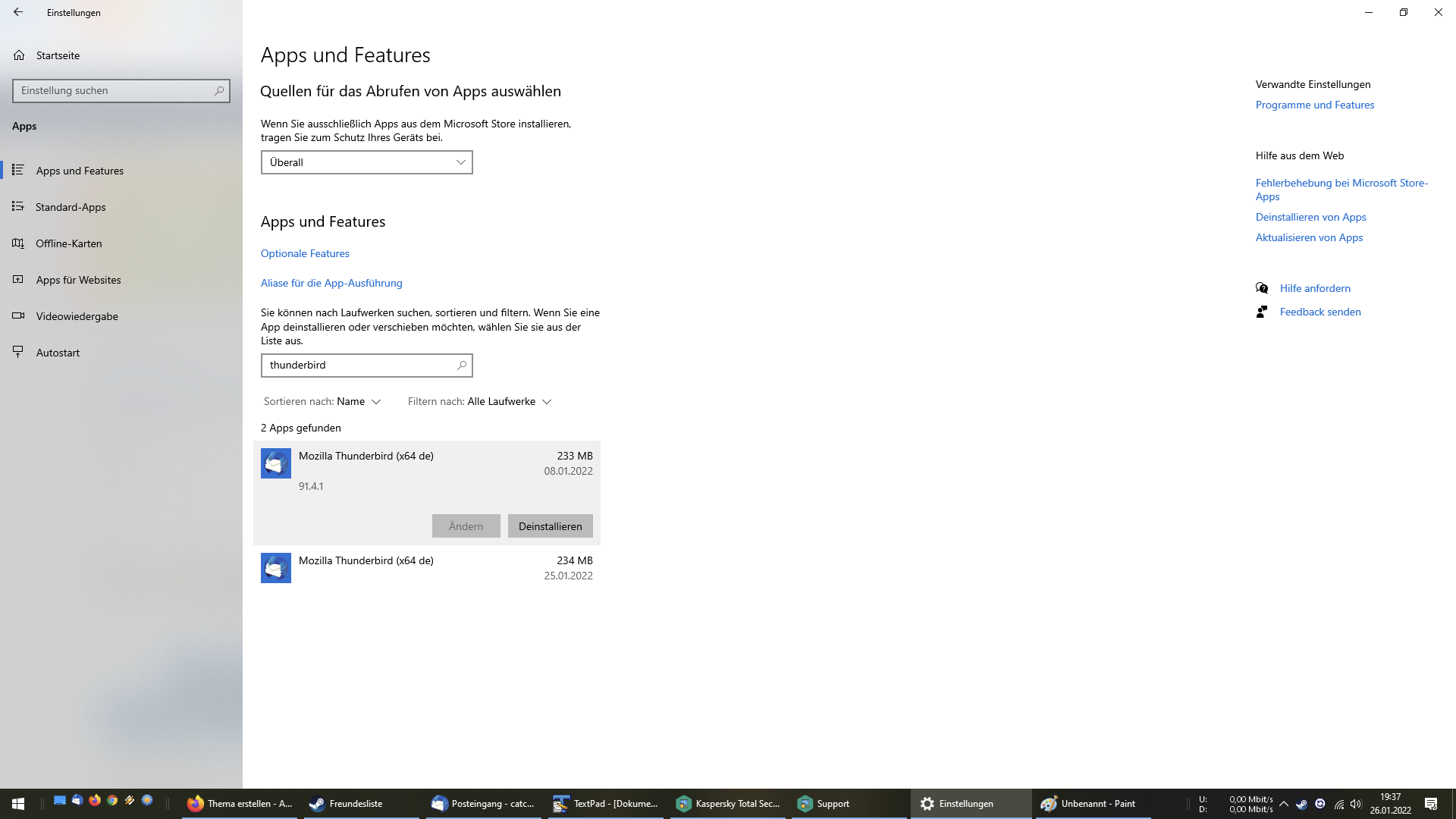 ich beobachte schon länger, dass nach jedem In-Applikations-Update (Hilfe->Über Thunderbird), in der App Auflistung von Windows (Start->Einstellung->Apps & Features) immer noch die ältere Thunderbird-Version aufgeführt wird.