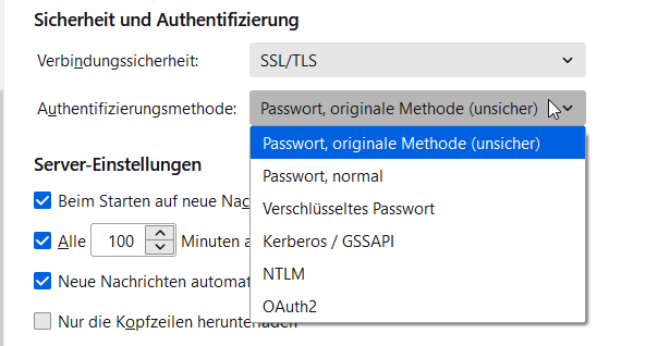 Allerdings war in in den erweiterten Einstellungen (nach Klick auf "Konfiguration bearbeiten") kein Eintrag der Art mail.server.serverX.authMethod = X vorhanden. Daher habe ich den Eintrag mail.server.server1.authMethod in der Ausprägung "Number" hinzugefügt und als Wert 2 zugewiesen. (Server1 ist bei mir GMX). Nun funktionuert der Mail-Abruf wieder "wie früher".