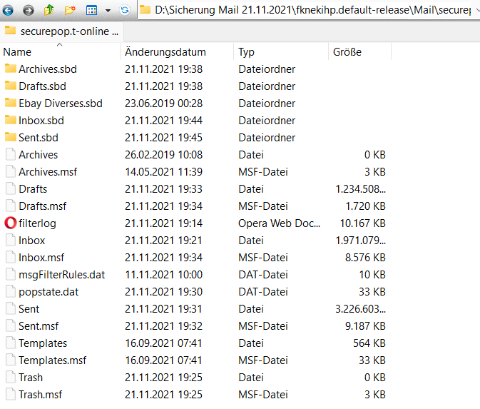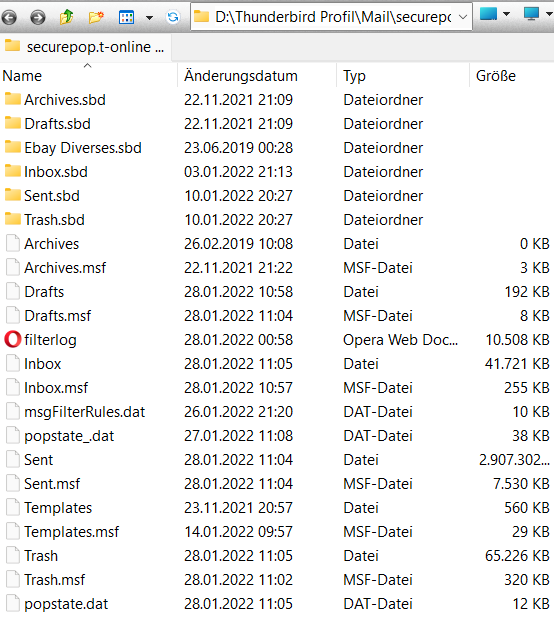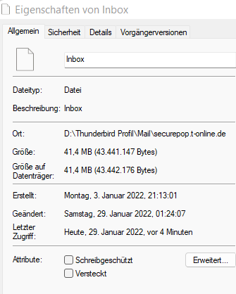 Gehe zunächst in den Profilordner von TB nach ...\Mail\pop.t-online.de\ und stelle die Größe der Datei (ohne Endung) Inbox fest. Am besten wäre ein Screenshot des Inhalts von pop.t-online.de (oder wie auch immer er genau heißen mag), in dem die Dateigrößen und das letzte Änderungsdatum zu sehen sind.
