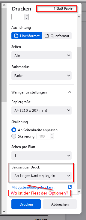 Es wird der Standard Druckdialog von Windows 10 gezeigt, den das System für möglich erachtet für den gewählten Drucker. Das fand ich nur heraus, da ich unter Adobe Acrobat Reader die Option zum Duplexdruck ebenso vermisste. Auch dieser zeigt zunächst den Windows Standard Druckdialog. Das fand ich heraus, da ich Acrobat gelöscht hatte (hätte ich gar nicht müssen), drucken aus anderen Anwendungen heraus, zeigten ebenso dieselben einfachen Optionen OHNE Duplexdruck.