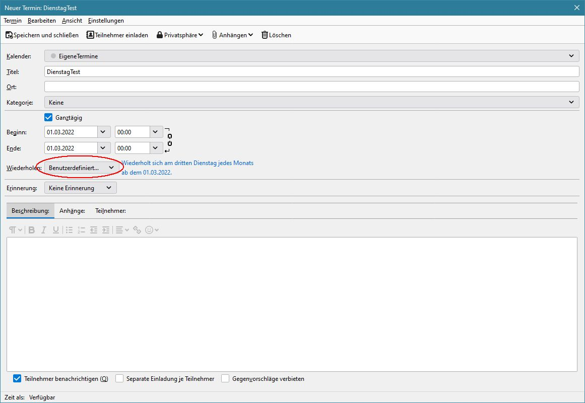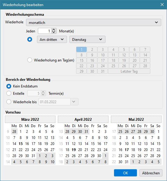 Ich habe eine Frage zu Serienterminen im Kalender. Ich möchte einen sich wiederholenden Ternin eintragen. Im konkreten Fall geht es darum, dass ich an jedem dritten Dienstag eines Monats erinnert werden möchte.