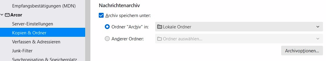 Dafür ist in dem Mail-Konto "Arcor" ein neuer Ordner "Archives" entstanden, der vorher nicht da war und der leer ist. Bild 1