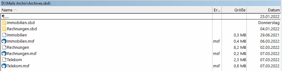 Ich habe meinen "localen Ordner" auf "D:/Mails local" gelegt und hier speichere ich meine wichtigen Mails in einemm Ordner "Archiv" mit mehreren Unterordnern. Bild 2
