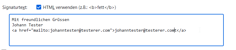 ich möchte am Ende meiner Signatur eine mailto '' Mailadresse'' anzeigen lassen. Was muß ich dazu eingeben und möglicherweise einstellen? Thunderbird 91.7.0(64Bit)