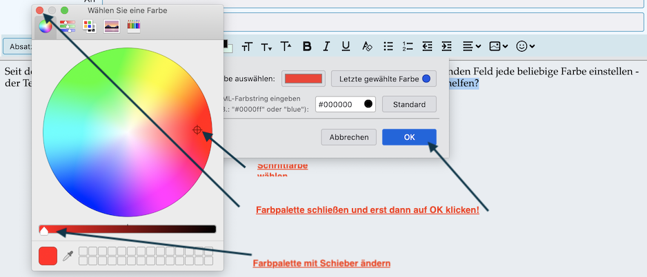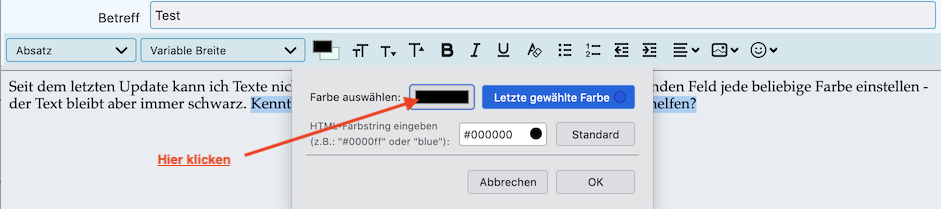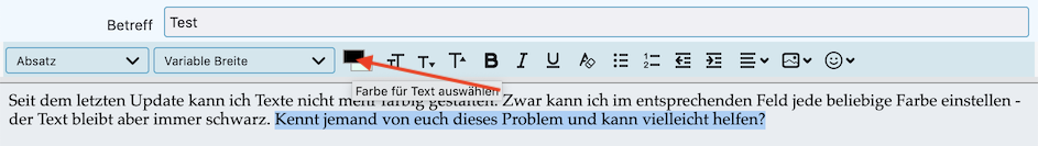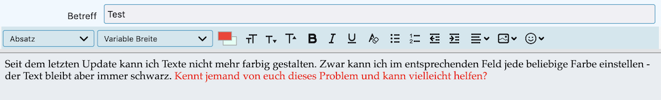 Seit dem letzten Update kann ich Texte nicht mehr farbig gestalten. Zwar kann ich im entsprechenden Feld jede beliebige Farbe einstellen - der Text bleibt aber immer schwarz.