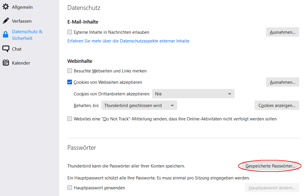 Das Master- oder Hauptkennwort sichert übrigens nur die gespeicherten Kennwörter im Thunderbird selbst gegen unbefugten Zugriff, nicht jedoch bereits lokal gespeicherte Mails.
