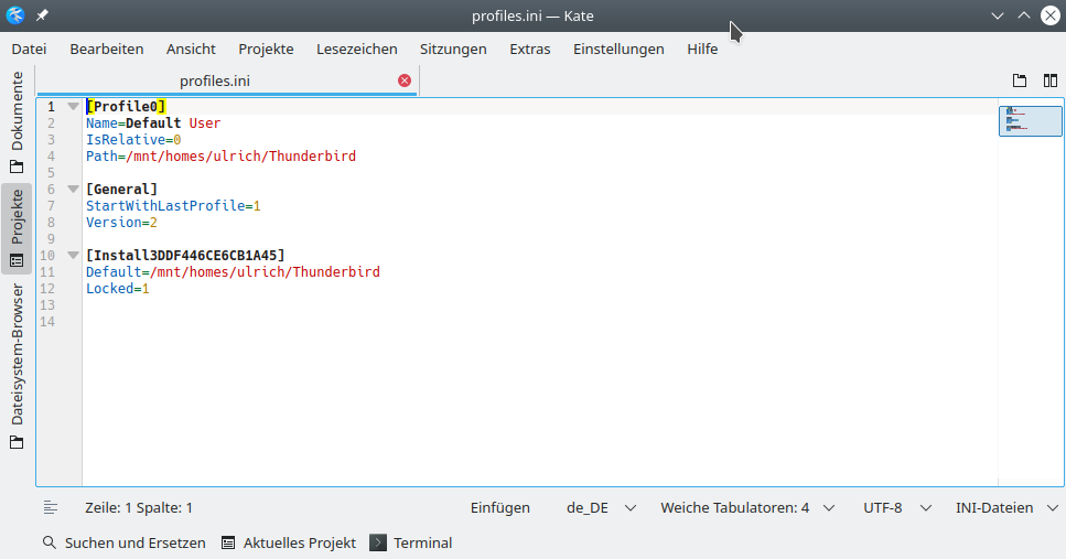 Gut – auf dem Zielrechner solltest du die gleichen Dateien unter ~/.thunderbird finden. Path= bzw. Default= zeigt dir das Profilverzeichnis an. Das kann z. B. so aussehen: Default=oo7nj6xm.default