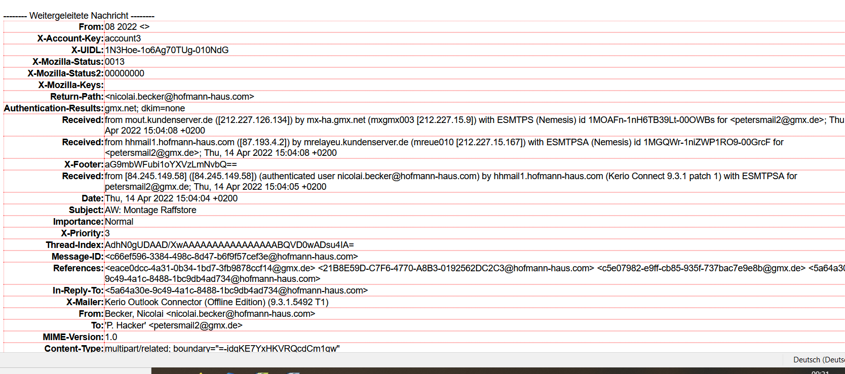 Beim Weiterleiten einer Nachricht erscheint der Header nicht als Text sondern >>siehe Anhang. Wie ändern???