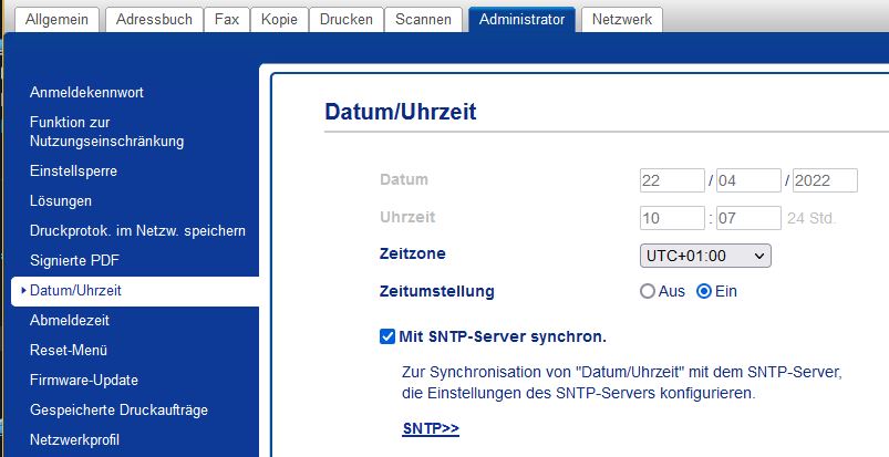 Wenn der Drucker hier die Zeitzone MEZ (UTC+1) hat und somit auf Normalzeit stünde, aber dennoch auf "Jetzt-Zeit" eingestellt ist, würde er in seinen Scan-2-Mail-E-Mails tatsächlich eine falsche Zeitangabe mitliefern.