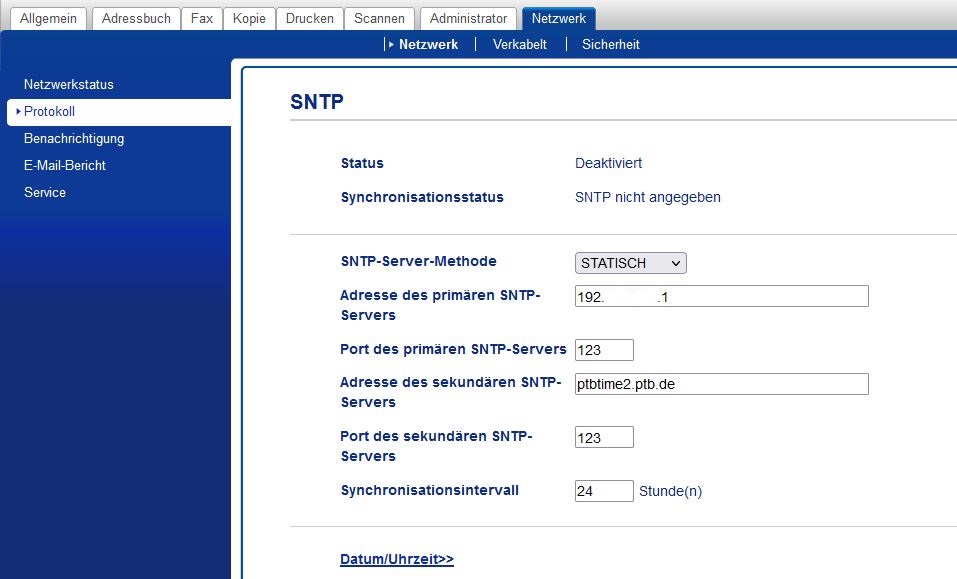 Wurde das beachtet? Der primäre SNTP ist hier meine Fritz!Box (die muss dann aber auch als Zeitserver konfiguriert sein) bzw. alternativ die PTB in Braunschweig.
