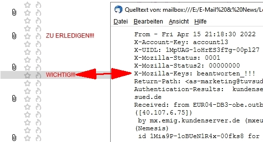 Versieht man eine Mail mit allen oben gezeigten Schlagwörtern, enthält 'X-Mozilla-Keys:' trotzdem nur max. 10 Einträge (was für eine interne Numerierung von 0-9 spricht), obwohl sie im Nachrichtenfenster zu sehen sind: