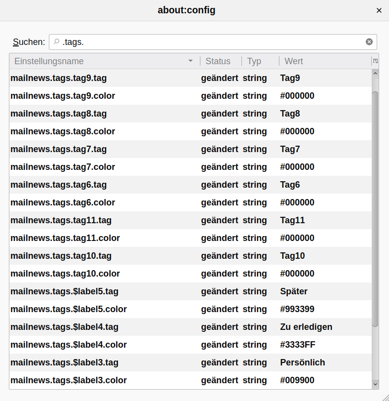 Über den Wert von mailnews.tags.xxx.tag wird diesem Platzhalter dann der gewünschte Anzeigename zugewiesen. Ebenso über mailnews.tags.xxx.color die zugehörige Farbe.