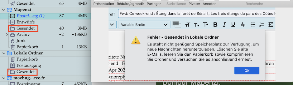• Emails der lokalen inbox nicht mehr sichtbar; Backup funktioniert nicht
