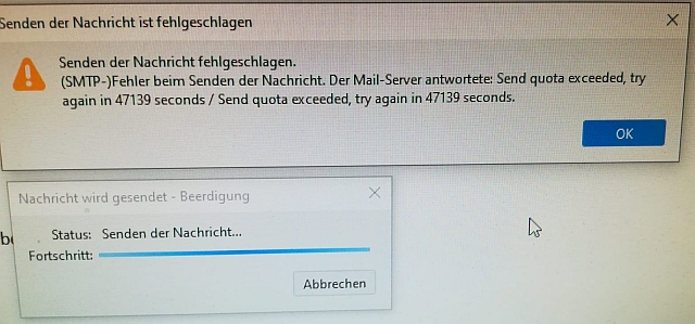 schau Dir mal den Screenshot in Beitrag #9 von mausebär an. Damit ist klar, dass sein Bekannter nicht primär dieses 'Gesendet lässt sich nicht zu Lokaler Ordner umstellen'-Problem hat. Das ist ein nebensächlicher Aspekt, wenn überhaupt. Die Speicher-Quota ist mutmaßlich auch nicht überschritten.