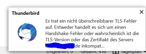 Der Gmail pop3 läuft sich tot und beim selbst gehosteten IMAP kommt ab und zu ein TLS Fehler (siehe Bild ). Senden funktioniert, beim selbst gehosteten Server kommt zwar eine Fehlermeldung, gesendet wird aber trotzdem.