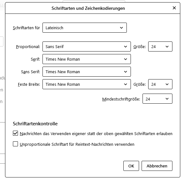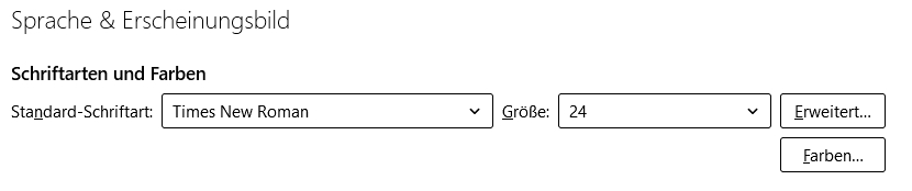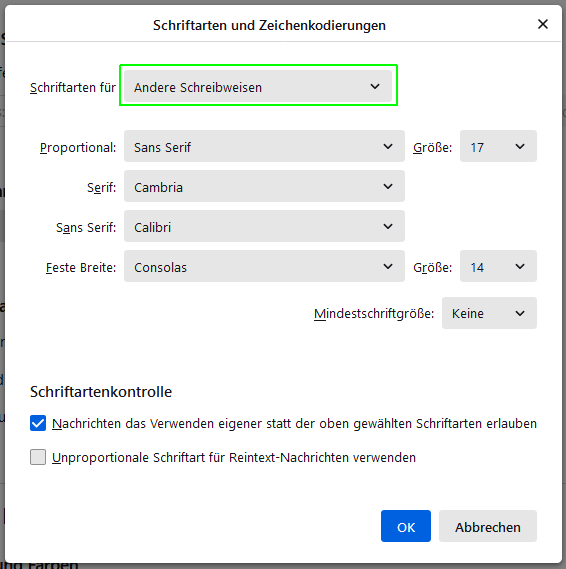 Einstellungen der Schriftarten sollte man immer für 'Lateinisch' und 'Andere Schreibweisen' vornehmen!