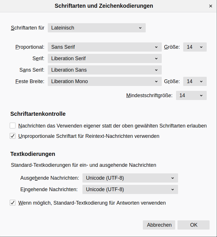 In Schriftarten und Zeichenkodierung ist bei mir unter "Unproportionale Schriftart für Reintext-Nachrichten verwenden" Schluss.