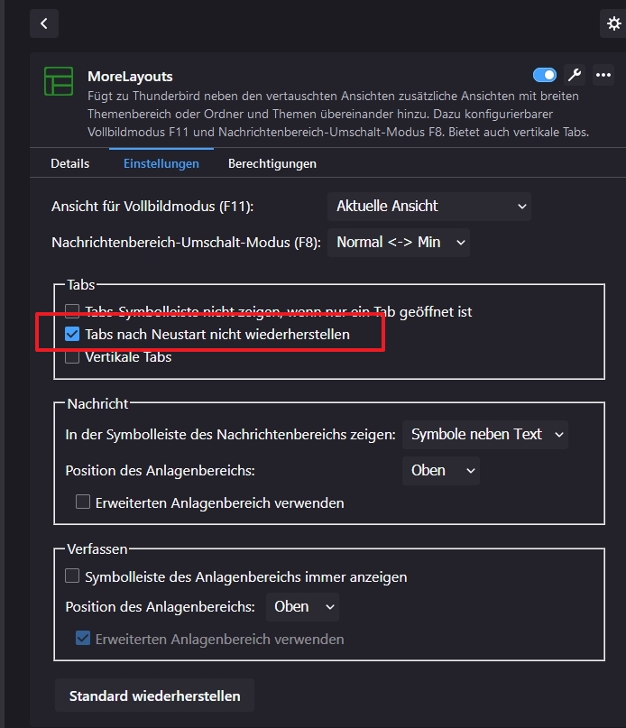 Für mich wäre es daher eine Hilfe, wenn offene Tabs (außer dem Posteingang) beim Schließen des Programms automatisch geschlossen werden, so wie im Browser. Kann man das irgendwo so einstellen?