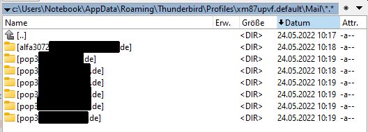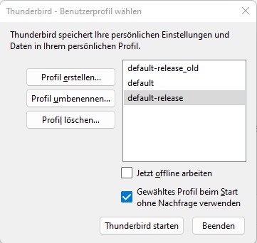 leider hatte mein normaler 'Hauptrechner' einen Absturz, er reagierte unter Win11 gar nicht mehr. Mittels Linux konnte ich jedoch - mit mächtig Aufwand - noch alle Partitionen auf eine externe FP retten. So auch die relevanten Dateien aus dem TB Profile Verzeichnis.