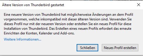 Nach einem Systemfehler aufgetreten während der kürzlichen Hitzewelle konnte ich Win10 reparieren mit Erhalt der persönlichen Daten und Apps, Thunderbird startet jedoch trotzdem nicht mit folgender Meldung: "Eine neuere Version von Thunderbird hat möglicherweise Änderungen an dem Profil vorgenommen, welche inkompatibel mit dieser älteren Version sind..." Entsprechend den Anweisungen habe ich die neueste TB-Version runtergeladen und ein neues Profil erstellt, nachdem ich das alte Profil gesichert habe. Es gelingt mir jetzt trotzdem nicht, Thunderbird mit allen 10 Email-Accounts und 12,6 GB Emails aus über 10 Jahren zu starten. Welche Ordner und Daten müssen aus dem gesicherten alten Profil in das neuerstellte Profil übertragen werden, um die alte Konfiguration wieder herzustellen?