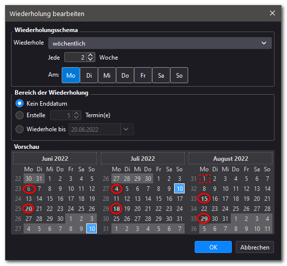 Wie unten, leider etwas schlecht zu sehen, fehlt am 1.8. der Termineintrag. Der Termin ist eingestellt vom 20.6.2022, jeden Montag, alle 14 Tage ohne Endetermin: