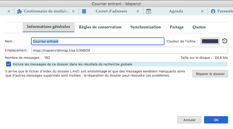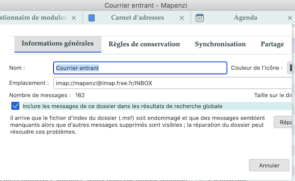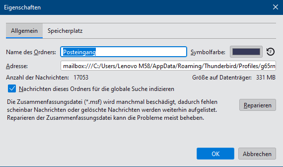 Die mail-Ordner - also nur für die mails selber - befinden sich auf einem externen SD-chip in einem SD-Laufwerk des Rechners. Da ich wöchentliche back up's mache, habe ich eine der back-up SD-Karten getestet, war aber negativ.