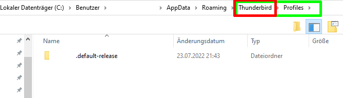 - TB-Anwendungsordner inkl. Profilordner (*) vom alten Computer kopieren, und zwar den Ordner %AppData%\Thunderbird\ samt allen Inhalten.