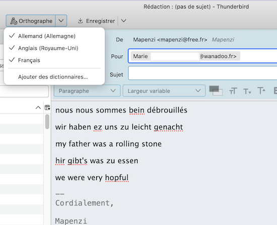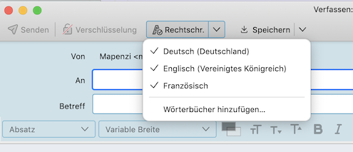 Wenn ich eine E-Mail verfasse, startet die automatische Rechtschreibprüfung Deutsch einwandfrei. Alles funktioniert.