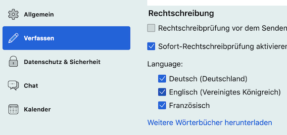 Ich verfasse E-Mail in Deutsch oder Englisch. Ich habe die Wörterbücher Deutsch und Englich installiert. "Sofort-Rechtschreibprüfung aktivieren" ist aktiviert,