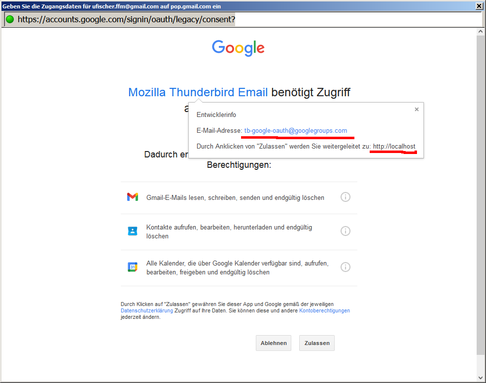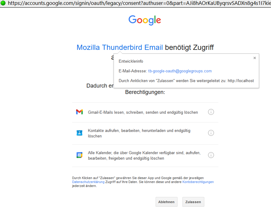 Das liegt daran, dass ich in meinem Screenshot den Teil, der hinter "https://accounts.google.com/signin/oauth/legacy/consent?" kommt, entfernt habe. Danke für die Bestätigung, dass die Angaben im Popup-Fenster richtig sind.