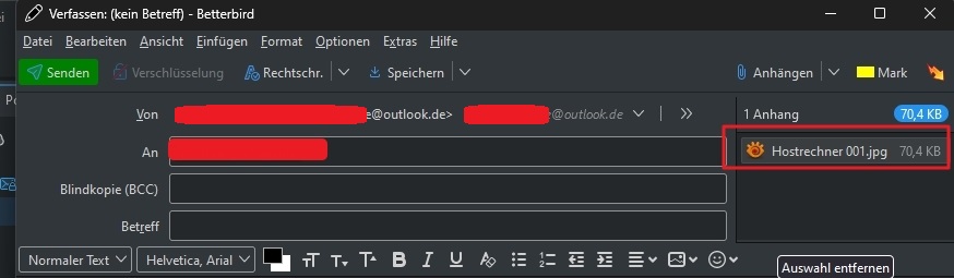 Verfassen-Fenster: Ansicht des Anhangbereichs über Textfeld/rechts neben Adressfeldern