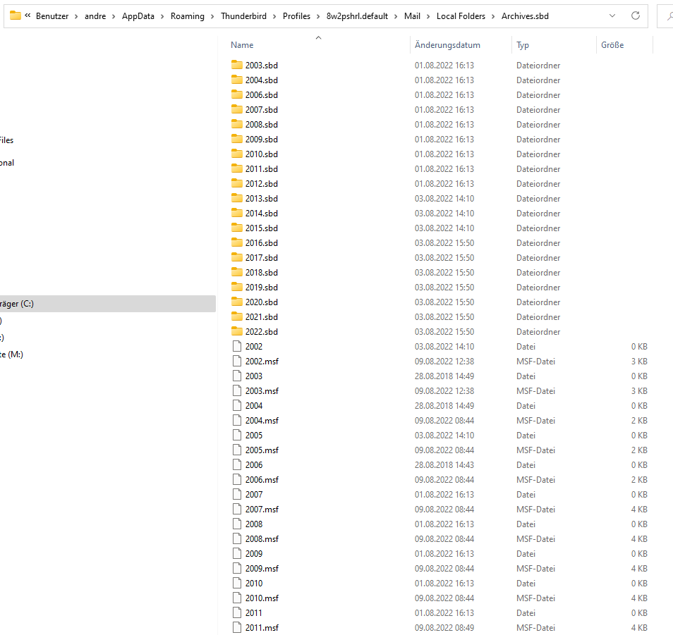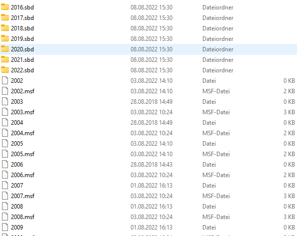 Im zweiten und dritten Screenshot sind etliche Mbox-Dateien mit Jahreszahlen als Namen sichtbar, die offenbar keine Nachrichten enthalten (0 kB). Das ist aber völlig normal, da zu diesen Mbox-Dateien wie 2002, 2003, 2004 , .... etc namensgleiche 2002.sbd, 2003.sbd, 2004.sbd-Ordner gehören, die selber wieder Mbox-Dateien enthalten, vermutlich für die Unterordner der Monate oder Posteingang/Gesendet. D. h. die Jahres-Mbox-Dateien enthalten selber keine Nachrichten, sind aber "lebensnotwendig" für die Anzeige der Unterordner des Ordners 2002 ....usw. in Thunderbird.