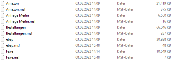 Dann bitte einen Screenshot mit dem Inhalt des Ordners "Local Folders" einstellen, auf dem auch die Größen der Mailbox-Dateien sichtbar sind.