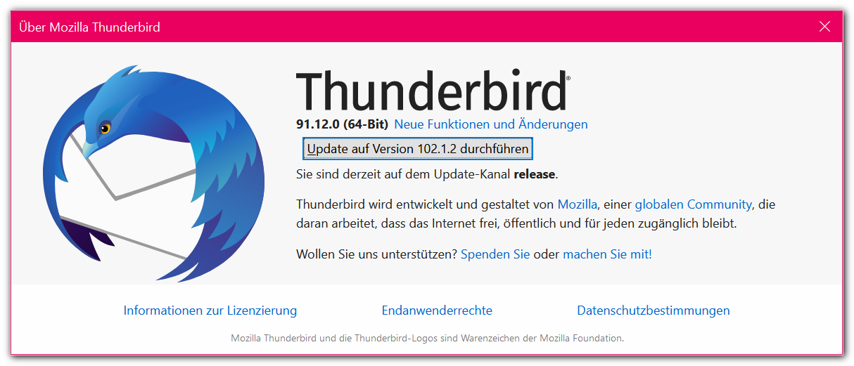 danke für die Info Graba, ja ok ich warte noch, aber wie soll ich auf 91.13 updaten wenn jetzt schon "NUR" die Version 102.1.2 (unter Hilfe/über Thunderbird ...) angezeigt wird ?