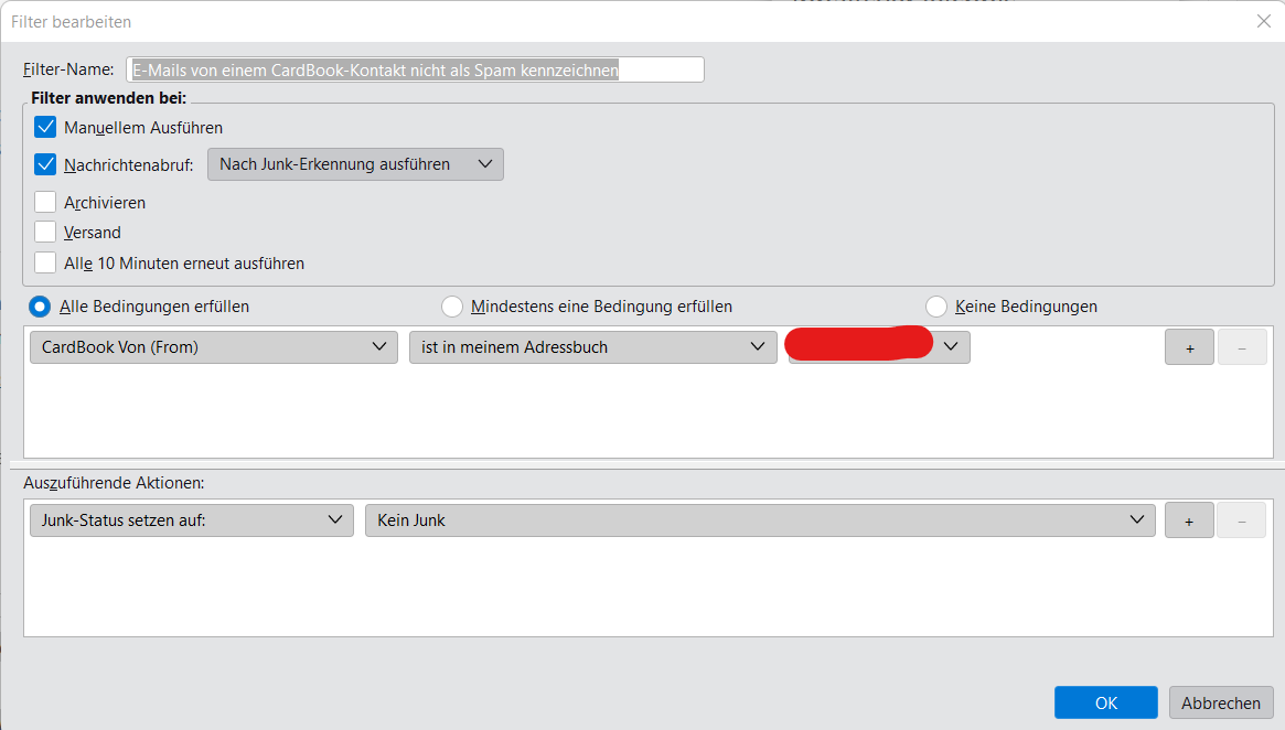 Meine Idee ist: Thunderbird erkennt Junk, verschiebt das in den Junk-Ordner des Kontos, sobald ich den Absender des Junks mit Cardbook in ein Google-Adressbuch eintrage, sollen alle künfitgen Nachrichten des Absenders als gelesen markiert und in den Papierkorb geschoben werden.