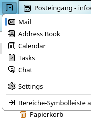 31. August 2022 um 07:44 #1 • Thunderbird-Version (konkrete Versionsnummer): 102.2.0 • Betriebssystem + Version: Windows 10, openSUSEHallo,habe einen kleinen Schönheitsfehler, im Bereiche-Menü sind bei mir die Einträge auf Englisch.Wird die Symbolleiste angezeigt, ist alles OK.