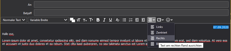 Das ist .. per se ein hoffnungsloses Unterfangen. Um etwa das Datum rechts am Rand darzustellen, gibt es eine Standardformatierungsfunktion Namens 'Rechtsbündig'. Siehe Screenshot. Aber dafür ist Verfassen in HTML erforderlich. Für Reintext-Mails geht das nicht.