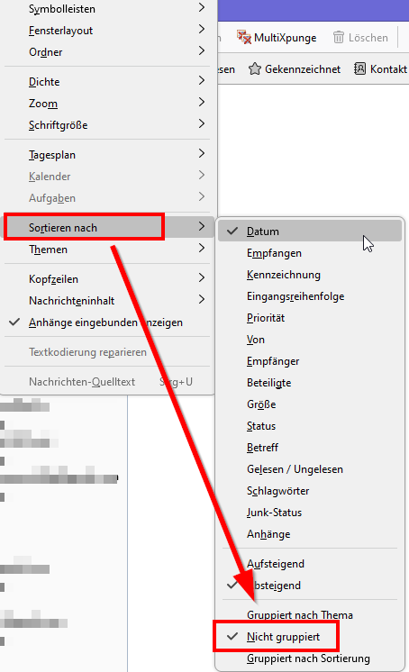 Die Thunderbird Threadfunktioni ist deaktiviert. Das soll auch so sein, weil Threadansichten unerwünscht sind.