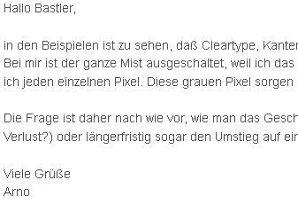Die Schrift in den Menüs, Reitern etc. von Thunderbird ist nach wie vor scharf, aber die der Ordner, im Betreff, Von, Datum etc. ist total verwaschen und macht Kopfschmerzen. So, wie es ist, ist es für mich untragbar.
