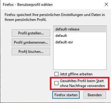 Ich möchte gerne mit TB die Links in einem 2. FF Profil öffnen lassen. Leider habe ich hier und im Netz nicht gefunden bzw. was ich gefunden habe funktioniert nicht. Man soll in TB > Einstellungen > Konfiguration bearbeiten das hier eingeben "network.protocol-handler.warn-external" und dann von false auf true stellen. Das war bei mir schon auf true. Dann soll beim Anklicken eines Links ein Fenster aufgehen wo ich wählen kann mit welchen Browser ich den Link öffnen möchte. Das Fenster geht bei mir nicht auf der Link wird direkt in FF geöffnet. Entweder FF öffnet sich oder wenn schon offen geht ein TAB auf. Oder aber es kommt der Hinweis das FF schon ausgeführt wird und es öffnet sich gar nichts. Gibt es irgendwo eine Möglichkeit das so einzustellen das TB mit dem 2. FF Profil die Links öffnet? Oder ist das mit TB 102.2.2 nicht möglich?