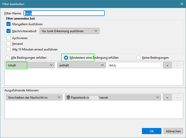 Wie gesagt, bei anderen Mails mit anderern "Links" funktioniert das. Ich habe z.B. einen Filter der nach teilen einer Abmeldeadresse filtert.