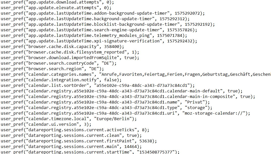In der Zeile steht dann hinten die Versionsnummer. Hier z.B. die entsprechende Zeile aus meiner prefs.js: "user_pref("extensions.lastAppVersion", "91.13.1");".