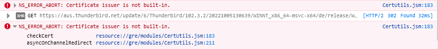 Jedenfalls habe ich trotz SSL-Proxy-Ausnahmen ähnliche Autoupdate-Probleme mit Thunderbird. Erst wenn die blockierende Regel für Port 53 aufgehoben wird, funktioniert der Updatemechanismus wie man das erwarten würde. Allerdings ist das Verhalten aktuell etwas differenzierter. Der autonome Update-Check bringt die Meldung aus #1 wie beim OP, der manuelle Weg über "Über Thunderbird" geht. Da könnte ich jetzt auf 102.3.2 upgraden, bleibe aber vorerst weiter bei 91.13.1. Die jeweiligen Updates der 91er wurden allesamt nicht automatisch installiert, obwohl das so eingestellt ist. Ging nur via "Über Thunderbird".