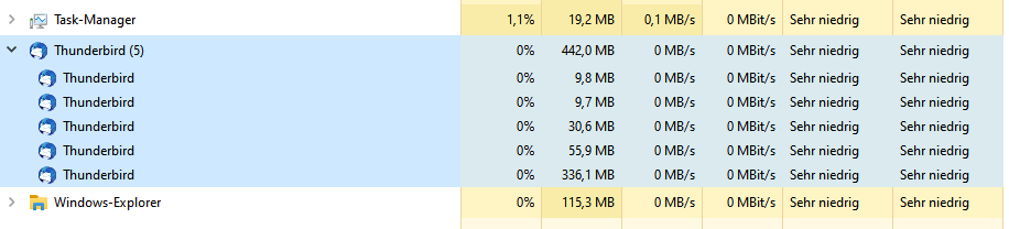 Es läuft auf Windows 10 64 bit. Im Taskmanager stehen unter CPU bei Thunderbird nur ca. 3%, aber es sind offenbar 6 Instanzen von Thunderbird offen.